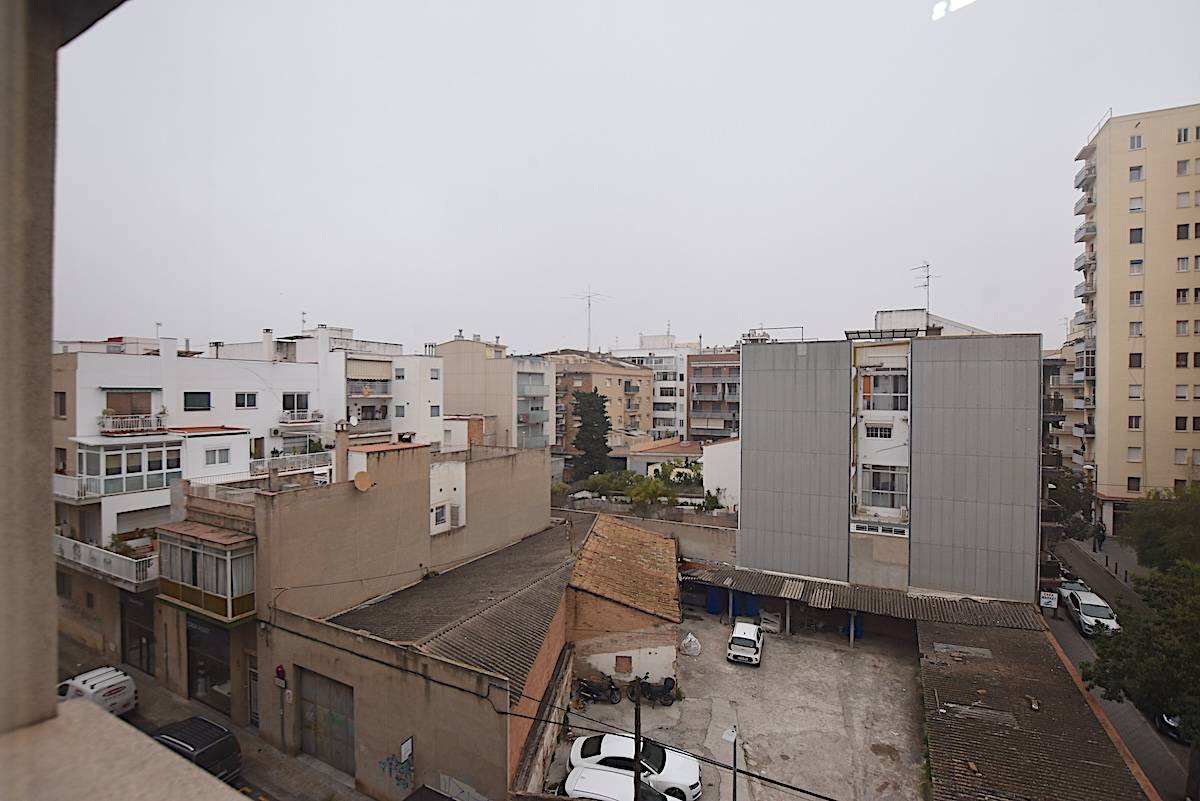El salón-comedor es amplio, bien proporcionado y con luz natural constante gracias a la altura y a sus vistas abiertas sobre la ciudad. Desde aquí se accede a una terraza de 20 m², un espacio exterior generoso que amplía la zona de estar y regala algo que en el centro no siempre aparece: un poco más de cielo.